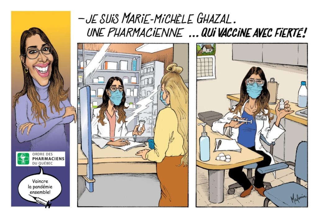 Les pharmaciens de tous les milieux à travers la province répondent en grand nombre à l’appel pour lutter contre la COVID-19. Qu’ils soient actuellement en pratique, d’anciens membres de l’Ordre, retraités ou étudiants, les professionnels de la pharmacie sont mobilisés pour prêter main-forte à l’effort de vaccination. L’Ordre des pharmaciens du Québec en est très fier et salue l’initiative de chacun! Ci-haut, une bande dessinée rendant visible Marie-Michèle Ghazal qui, à l’instar de ses collègues pharmaciens, est bien fière de vacciner.
